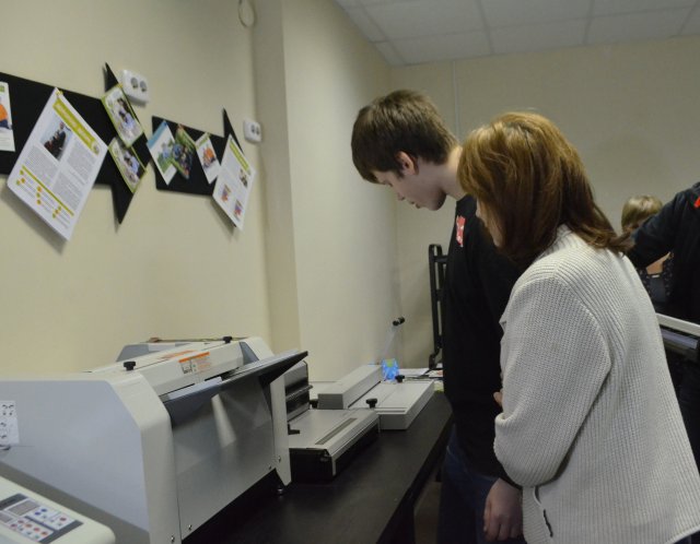 Руководитель полиграфической мастерской Екатерина Яркова рассказала, что для мастерской закуплено специальное профессиональное оборудование: буклетмейкер, большая печатная машина, ламинаторы, брошюраторы, два рабочих места для создания дизайна и макетов будущей продукции.